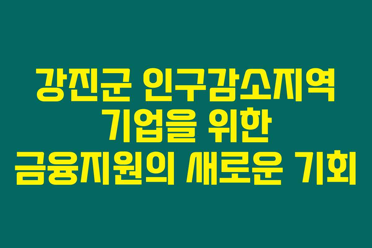 제가 직접 알아본 바로는, 강진군에서 제공하는 인구감소지역 기업지원 특례보증 금융지원 프로그램이 지역 기업들에게 경영 안정과 더불어 지역 경제 활성화를 위한 좋은 기회가 될 것으로 보입니다. 이번 금융 지원은 중소기업과 소상공인을 대상으로 하여, 생존에 어려움을 겪고 있는 기업들에게 필요한 자금 조달 방법을 제시하고 있습니다. 아래를 읽어보시면 이 프로그램에 대한 자세한 정보와 신청 방법을 알 수 있습니다.