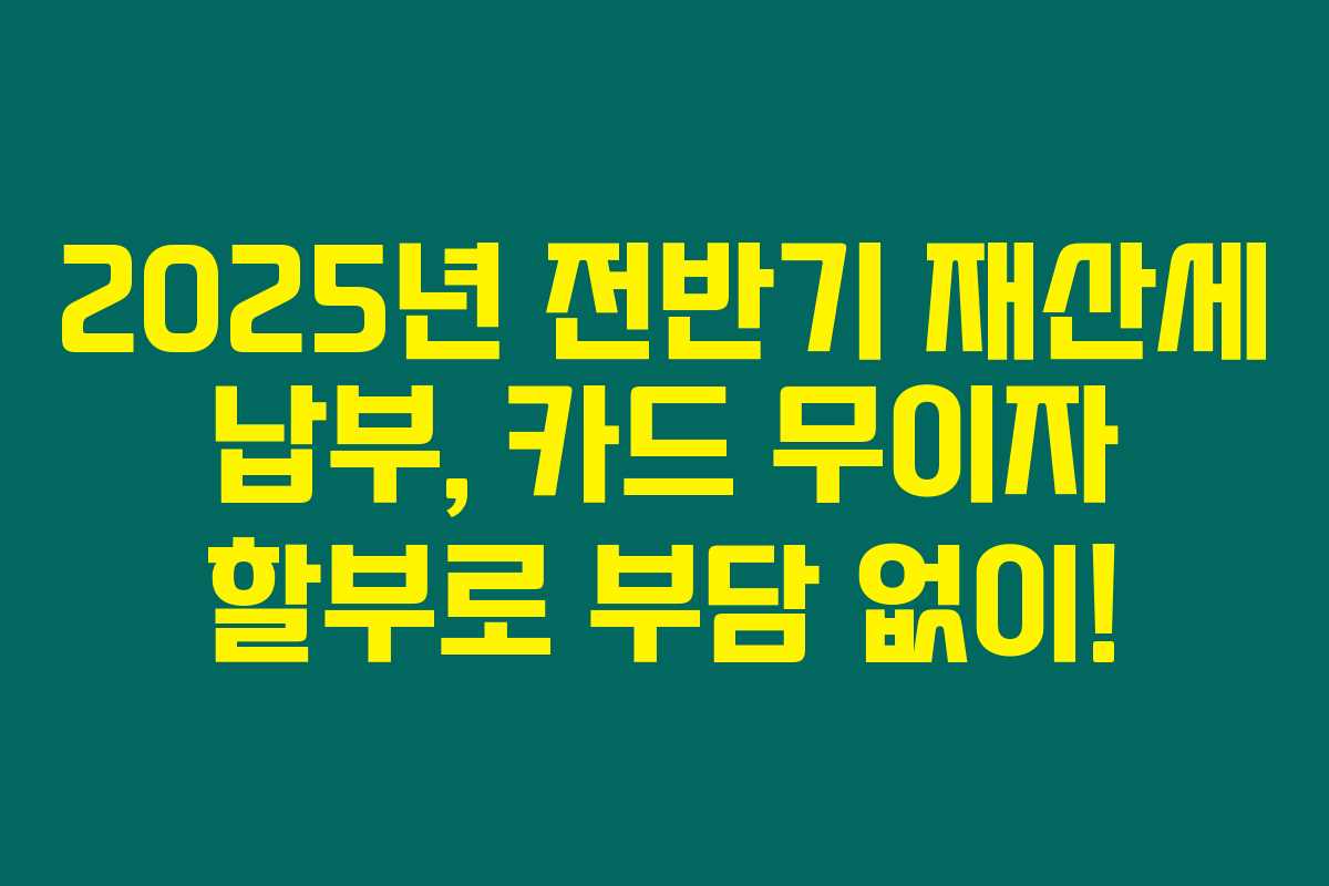 2025년 전반기 재산세 납부 시, 카드 무이자 할부 프로그램을 이용하면 더 부담 없이 세금을 납부할 수 있어요. 많은 카드사와 협약을 통해 제공되는 이 서비스는 여러 번에 걸쳐 세금을 나누어 납부 가능하게 해주는데, 특히 큰 금액을 한 번에 지출하기 어려운 경우에 정말 유용하답니다.