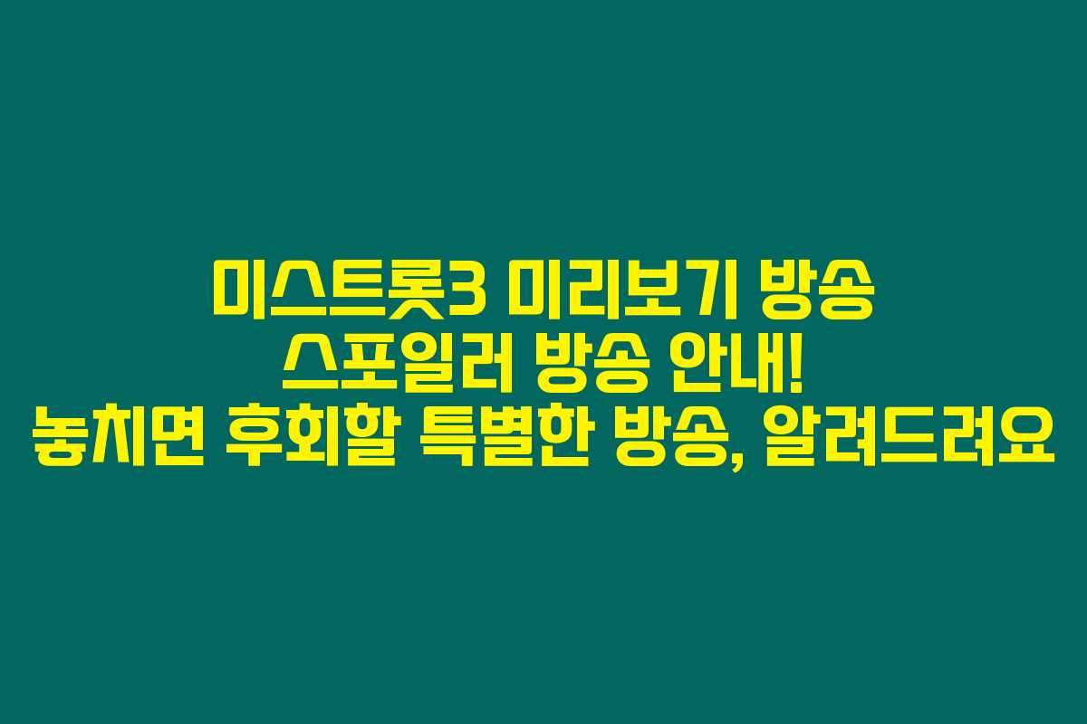 12월 21일 첫 방송을 앞둔 미스트롯3의 본방 전에 미리보기에 대한 스포일러가 공개됩니다! 정말 기대되는데요. 그렇다면 어떤 내용이 방송될지 궁금한 분들이 많으실 것 같아요. 트로트를 사랑하는 분들이라면 이번 미리보기 방송을 꼭 봐야 할 이유를 알려드릴게요. 아래 내용을 통해 미리보기 방송 정보와 시청 방법을 확인해 보세요!
