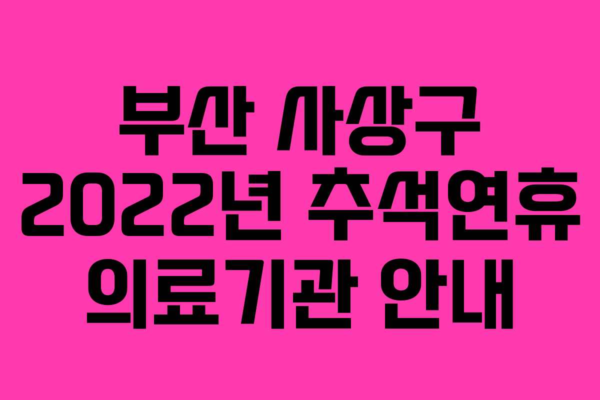 2022년 추석연휴는 9일부터 12일까지 총 나흘 동안 이어집니다. 이 기간 동안 갑작스럽게 아프거나 약이 필요할 경우 이용할 수 있는 병원 및 약국 정보를 미리 알아두는 것이 좋습니다. 아래는 부산 사상구에 위치한 진료 가능한 의료기관 목록입니다.
