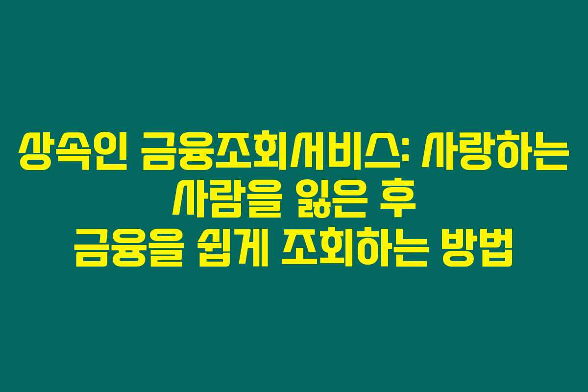 제가 직접 경험해본 결과로는, 사랑하는 가족을 잃는 것은 매우 힘든 일입니다. 그리고 그 아픔 속에서 상속과 관련된 금융 문제는 더욱 복잡하게 느껴지지요. 이러한 때에 도움이 되는 것이 바로 상속인 금융조회서비스입니다. 이 서비스를 통해 고인의 금융채권과 채무를 한번에 조회할 수 있는 방법에 대해 알아보겠습니다. 아래를 읽어보시면, 각종 준비물, 신청 방법, 조회 가능 금융회사 및 신청 후 회신 방법 등을 세세하게 알 수 있습니다.