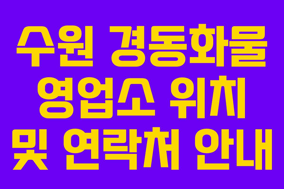 수원시에 위치한 경동화물 영업소는 다양한 지역에 분포되어 있으며, 각 영업소의 운영 시간과 연락처는 사정에 따라 변경될 수 있습니다. 따라서 방문 전에 전화로 확인하는 것이 좋습니다. 아래는 수원 지역의 경동화물 영업소에 대한 정보입니다.
