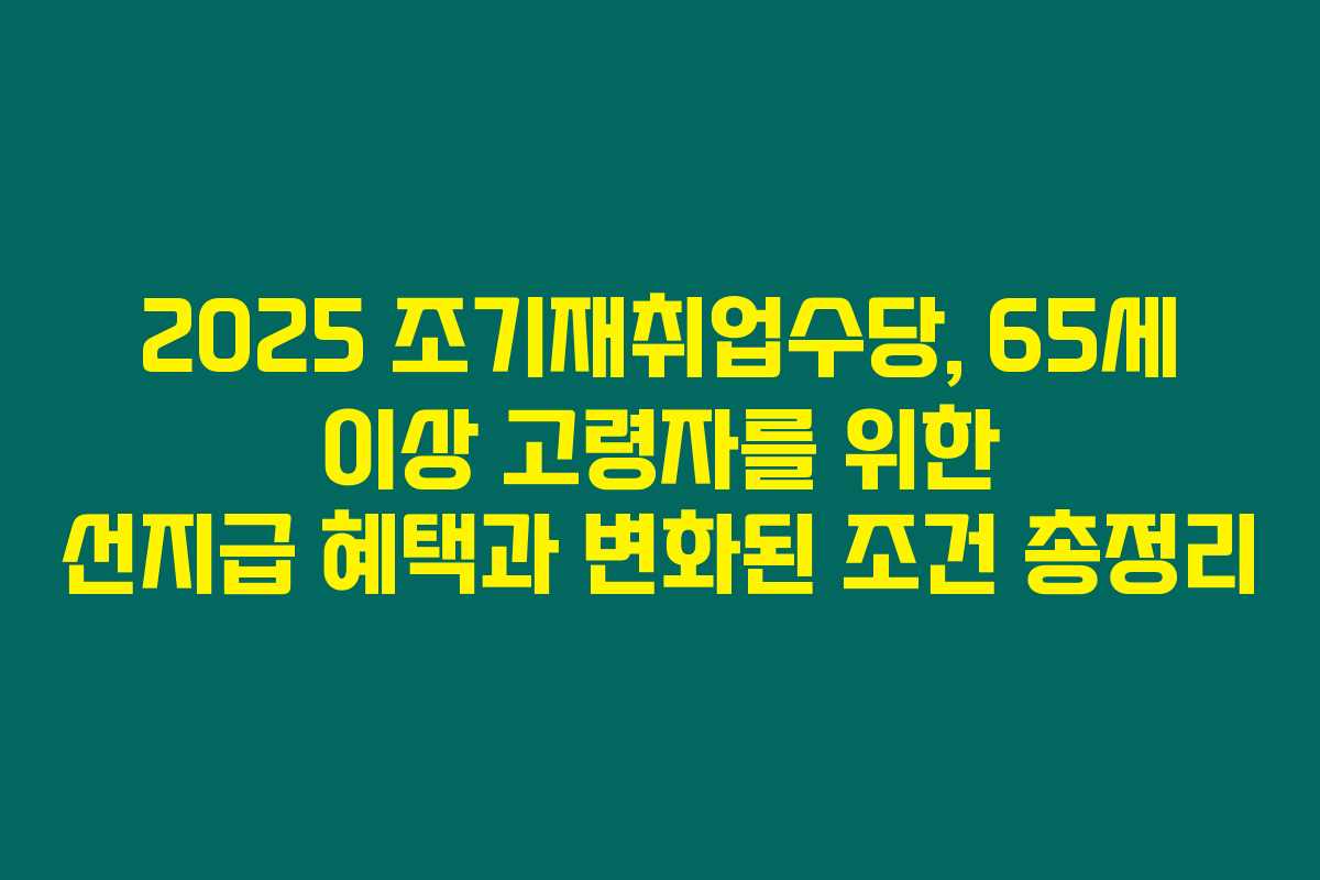 제가 직접 알아본 바로는 2025년 조기재취업수당 제도가 상당히 많이 변경되었습니다. 특히 65세 이상 고령자에게는 새로운 선지급 제도가 도입되어 보다 쉽게 혜택을 누릴 수 있게 되었다고 합니다. 아래를 읽어보시면 이 제도의 변천사와 필수 조건, 신청 방법, 자주 묻는 질문 등을 자세히 알 수 있습니다.