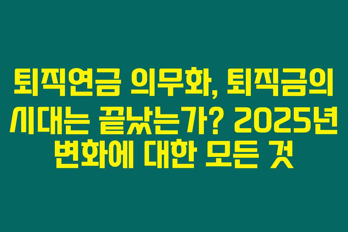 제가 직접 리서치한 바로는 2025년부터 시행될 퇴직연금 의무화 정책이 우리나라 근로자들에게 큰 변화를 가져올 예정입니다. 퇴직금 제도가 사실상 사라지고 연금 형태로 지급되는 이 새로운 제도는 모든 직장인들에게 해당되며, 특히 퇴직금 불안정성이 컸던 작은 사업장 근로자들에게는 기회가 될 수 있습니다. 아래를 읽어보시면 변화의 흐름과 함께 어떻게 준비해야 하는지 알아볼 수 있습니다.