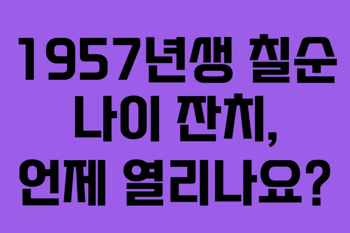 1957년생이라면, 2024년에는 한국식 나이로 68세가 됩니다. 따라서 70세가 되는 2026년에 칠순 잔치를 준비하면 좋습니다. 칠순은 전통적으로 70세 생일을 기념하는 잔치로, 가족과 친구들이 모여 축하하는 의미가 있습니다.